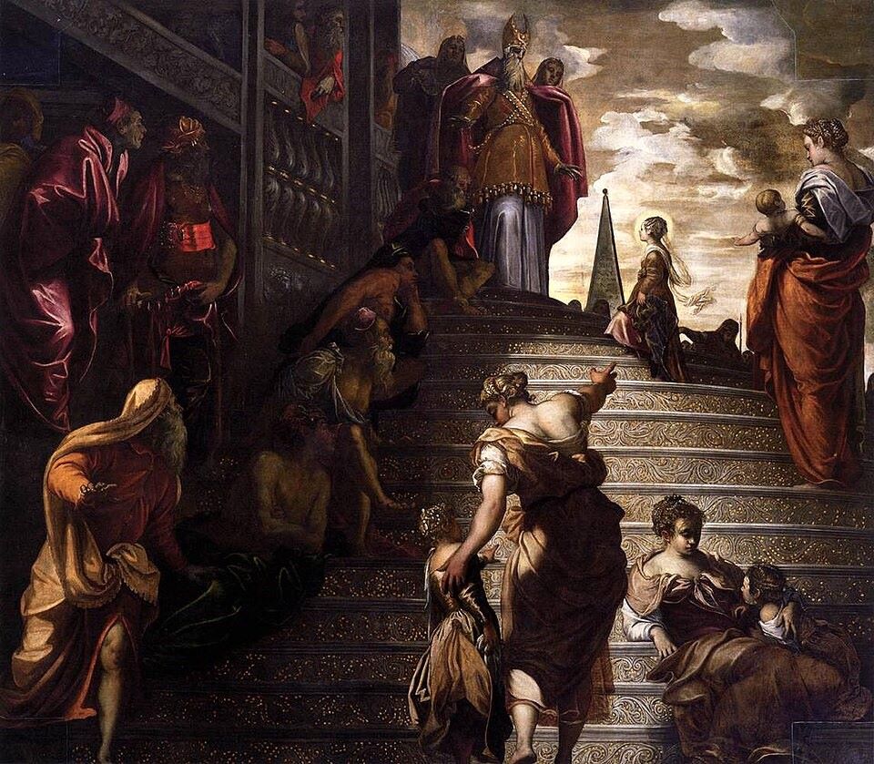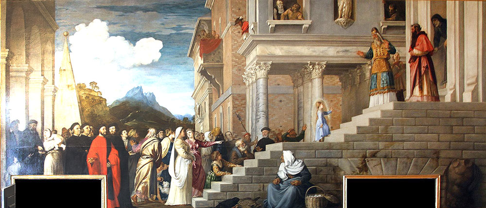 Tycjan namalował monumentalne płótno Ofiarowanie Maryi w świątyni (1534–1538) na zamówienie weneckiej Scuola Grande di Santa Maria della Carità. Dzieło, o wymiarach 345 × 775 cm, przedstawia młodą Maryję samotnie wspinającą się po schodach do arcykapłana. Płótno ma dwudzielną kompozycję. Monumentalna architektura świątyni dominuje po prawej stronie, a po lewej znajduje się otoczenie z budynkami i drzewami.